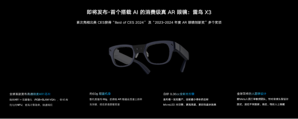 在MicroLED+光波导范畴,雷鸟立异继2023年发布并量产全球首款双目全彩Micro LED光波导AR眼镜雷鸟X2后,对光引擎的规划及量产工艺进行了全新晋级,使得新一代全彩MicroLED光引擎体积较前代大幅下降了近50%,光机量产良率提升至95%。一起,得益于工艺改进、波导规划和要害算法上的打破,新一代AR眼镜雷鸟X3整机分量将下降至约60g,续航时刻较上一代提升了近一半,而入眼显现亮度提高了一倍以上。