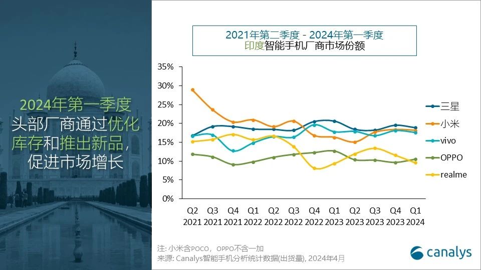 依据Canalys发布的陈述,2024年榜首季度,印度智能手机商场体现微弱,出货量达3530万部。进入2024年后,厂商的库存状况有所改善,这使得途径可以接受本季度推出的多款新品。因为 2023年榜首季度出货量较低,商场面对通胀压力、需求疲软、库存等问题,因而榜首季度商场同比增加15%。2024年榜首季度,三星以19%的比例和670万台的出货量坚持了商场榜首的方位。vivo以620万部的出货量位居第三。OPPO(不含一加)和 realme别离以370万部和340万部的出货量位居前五。